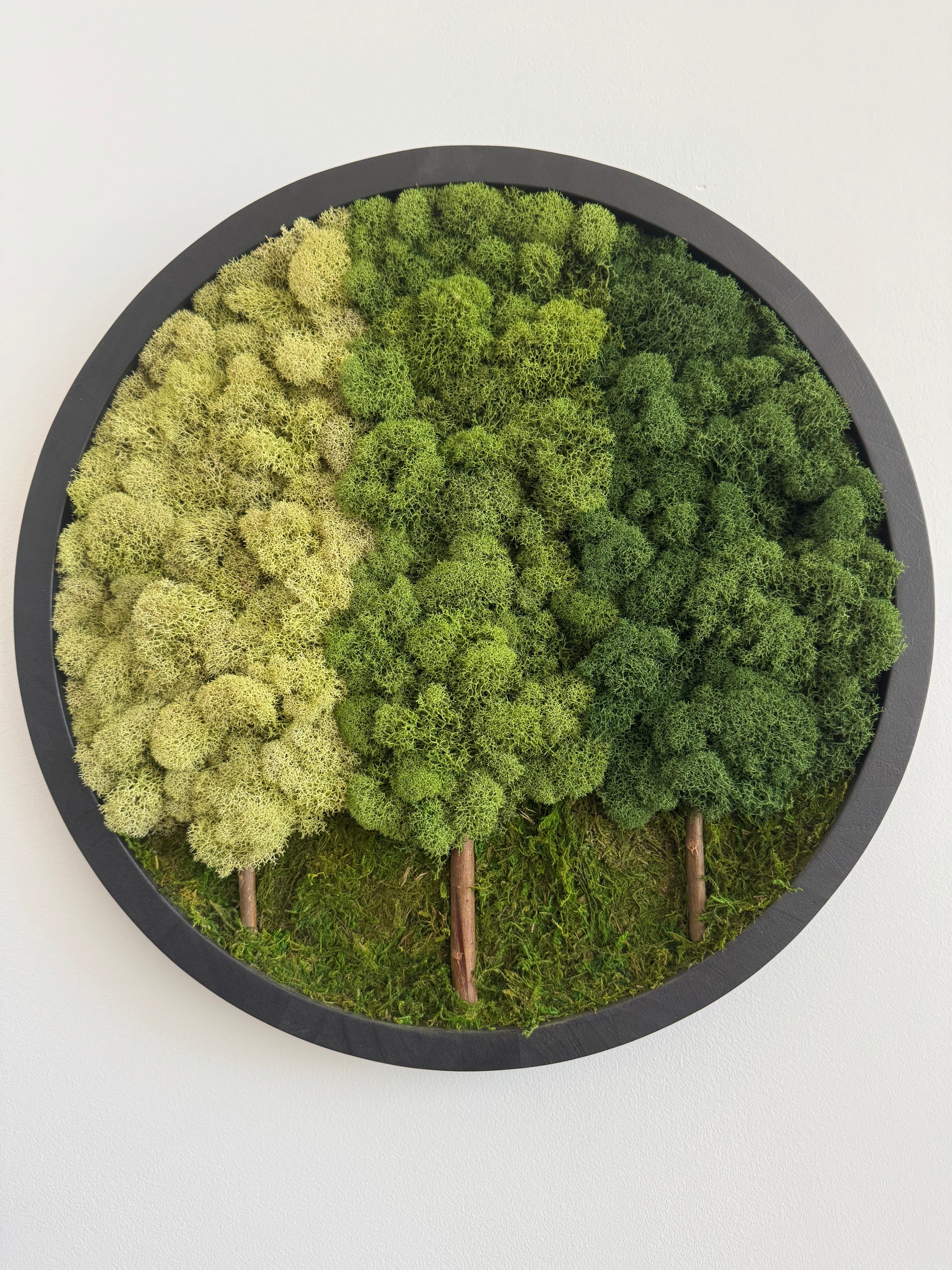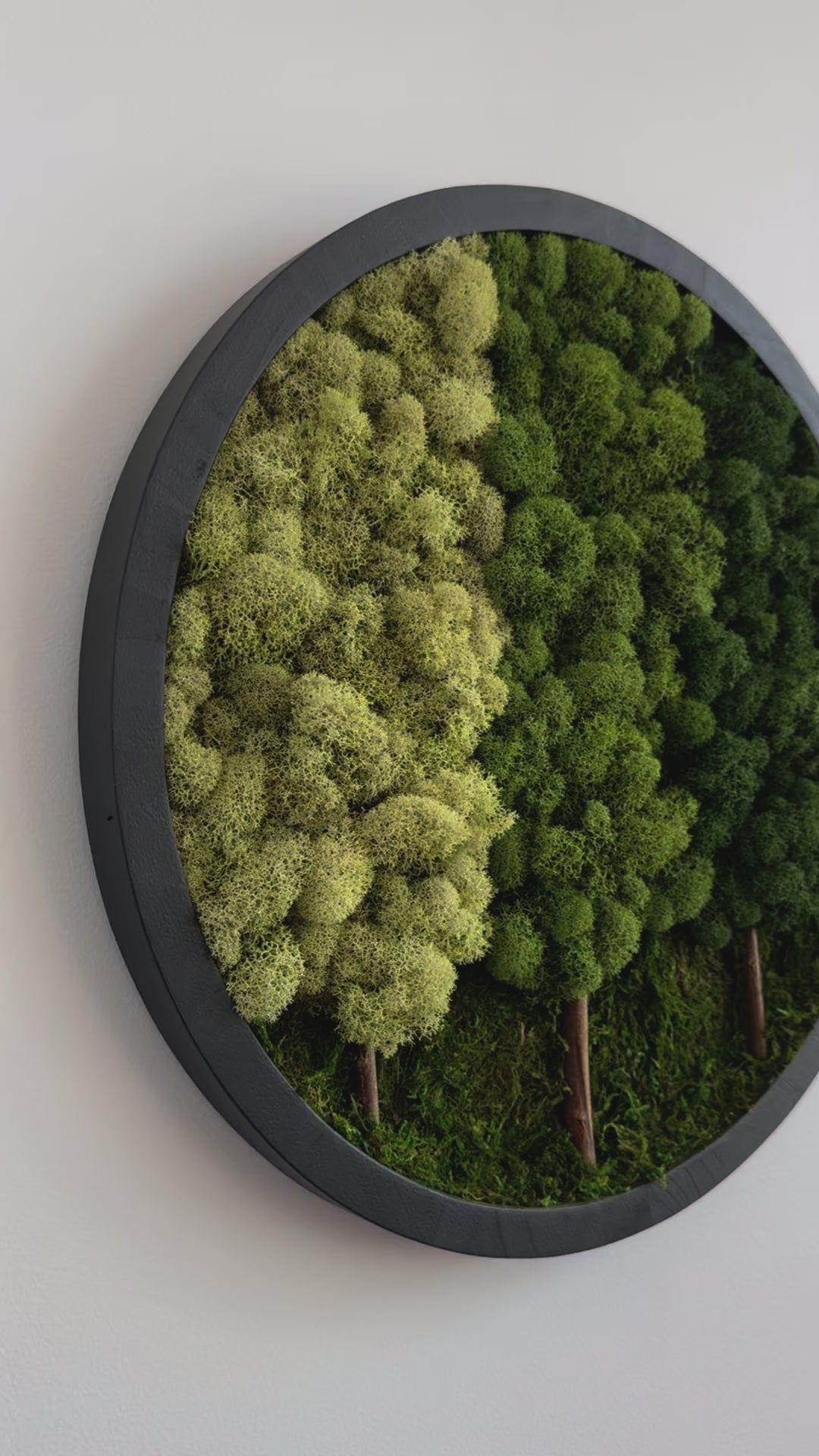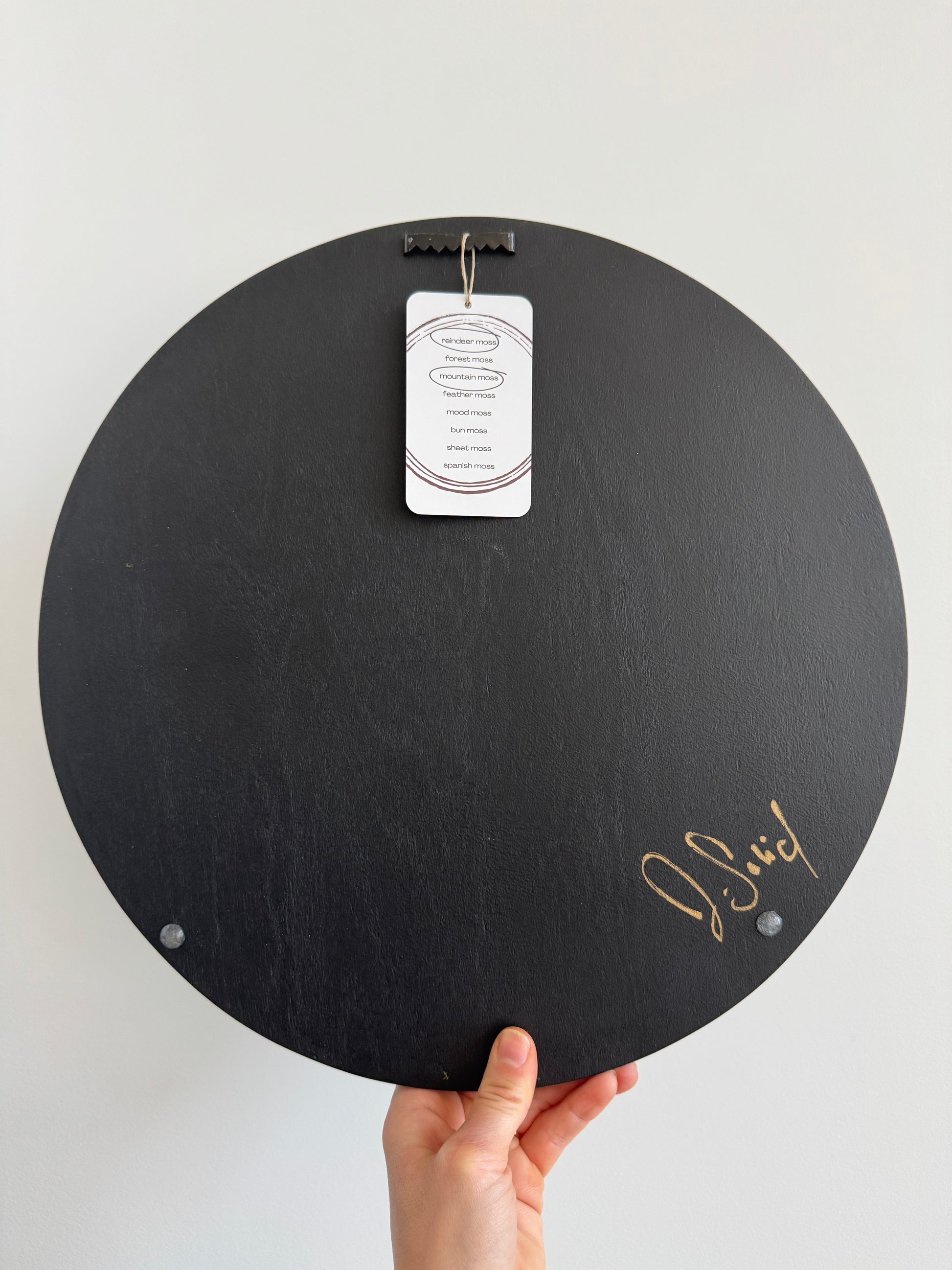 Preserved moss art on signed, ready-to-hang, circular wood frame.