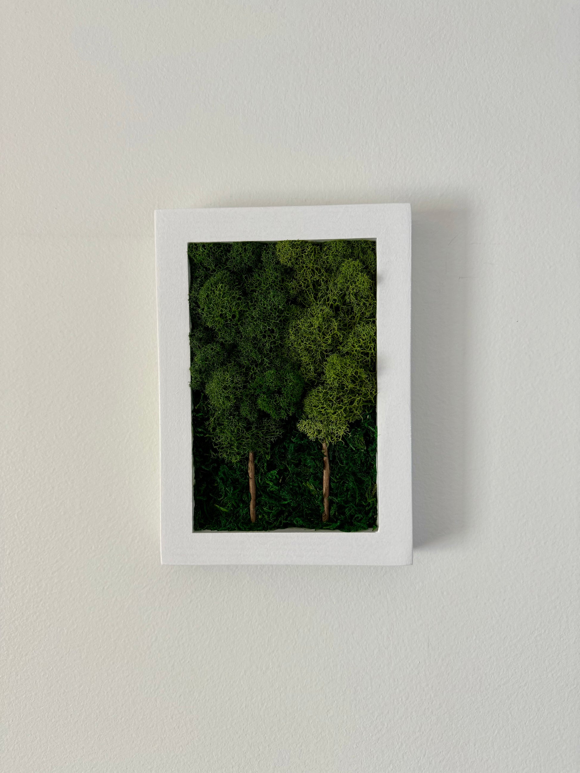 Preserved moss art on signed, ready-to-hang, vertically orientated, rectangular wood frame.