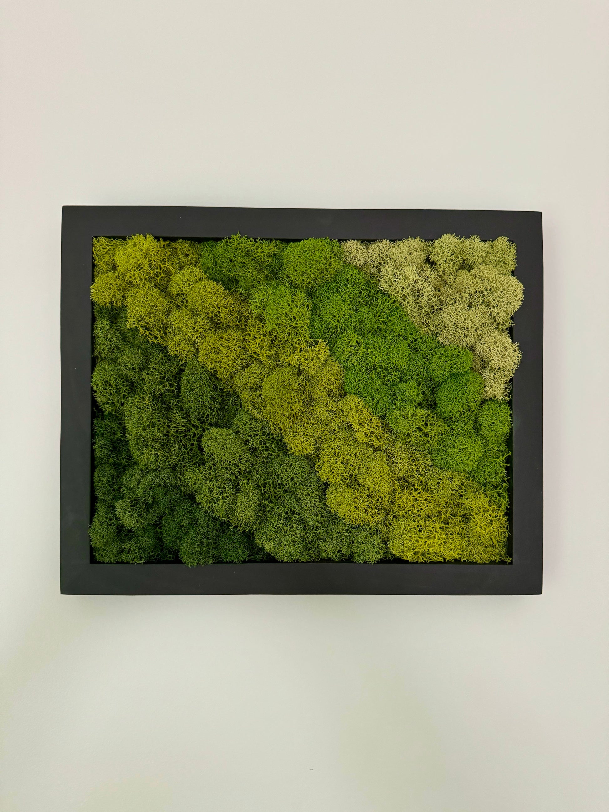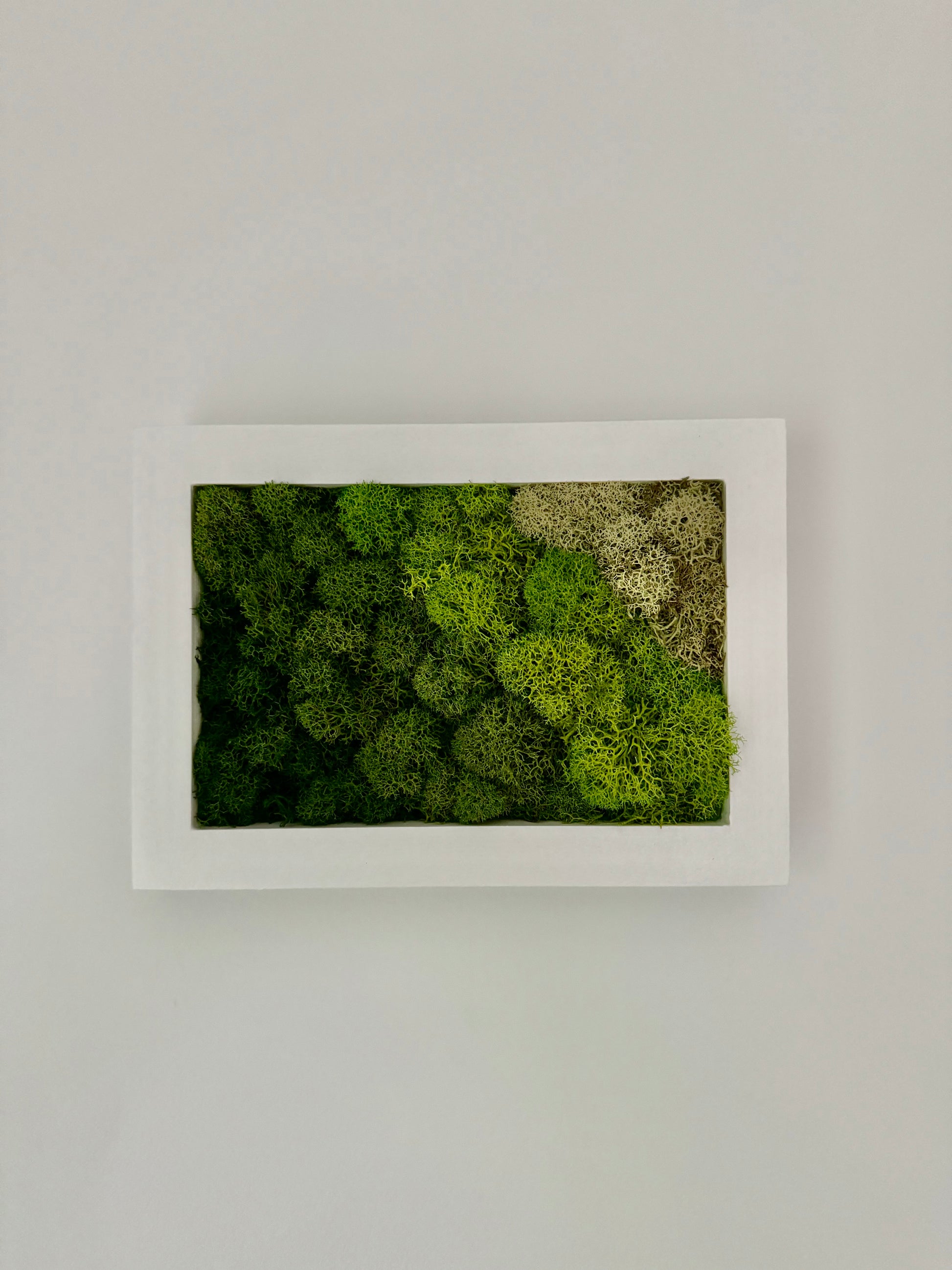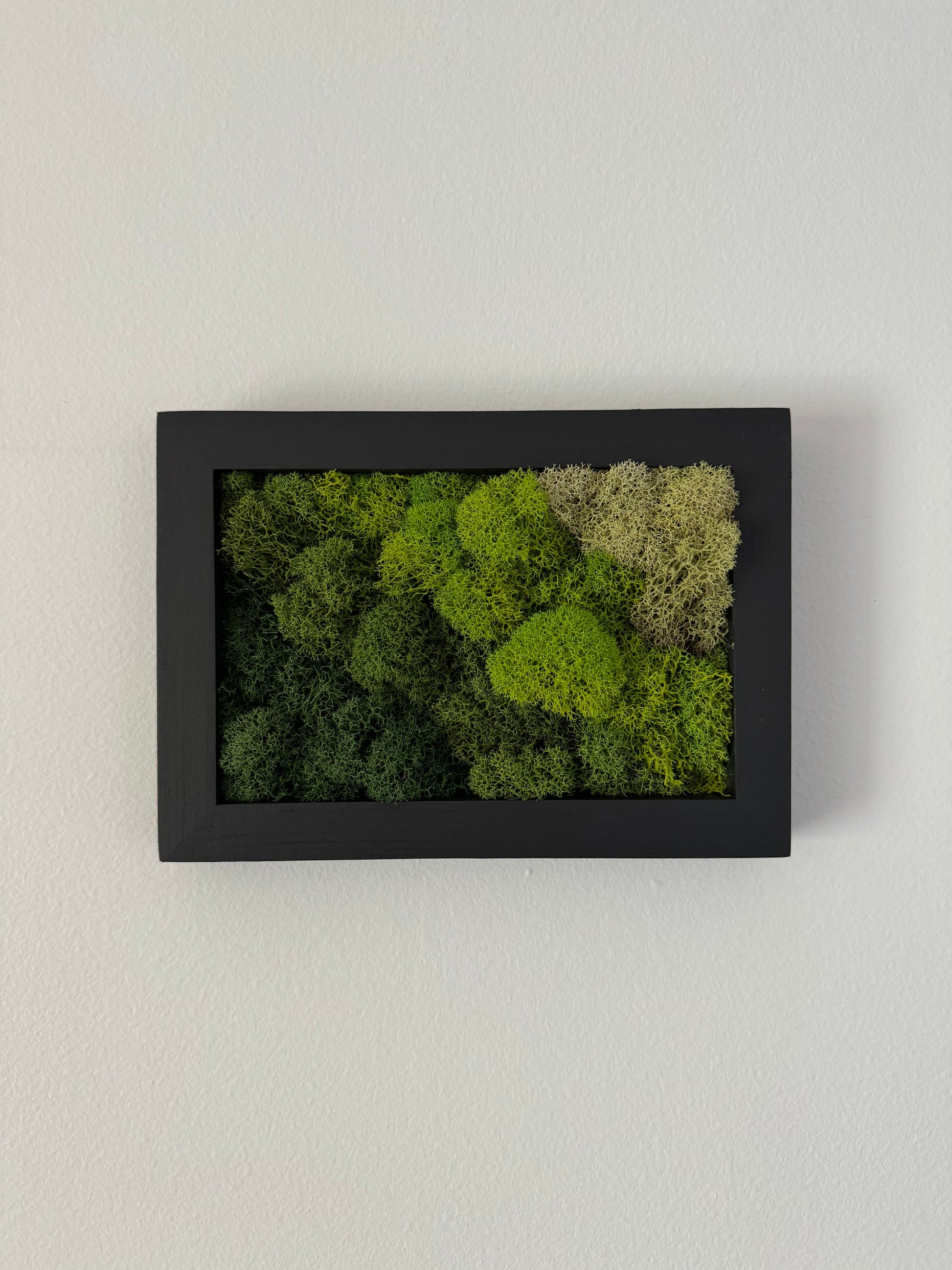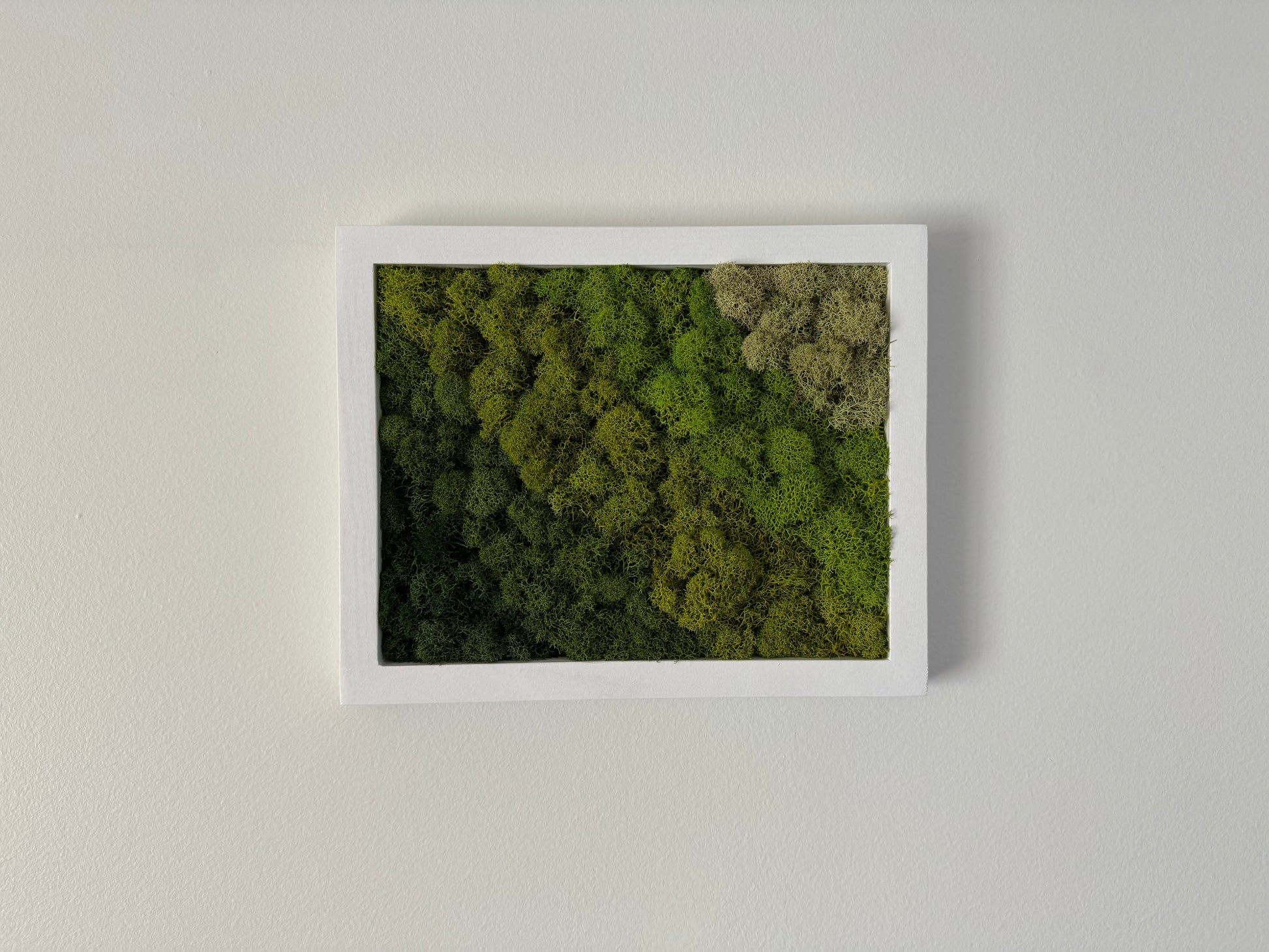Preserved reindeer moss art on signed, ready-to-hang, horizontally orientated, rectangular wood frame.