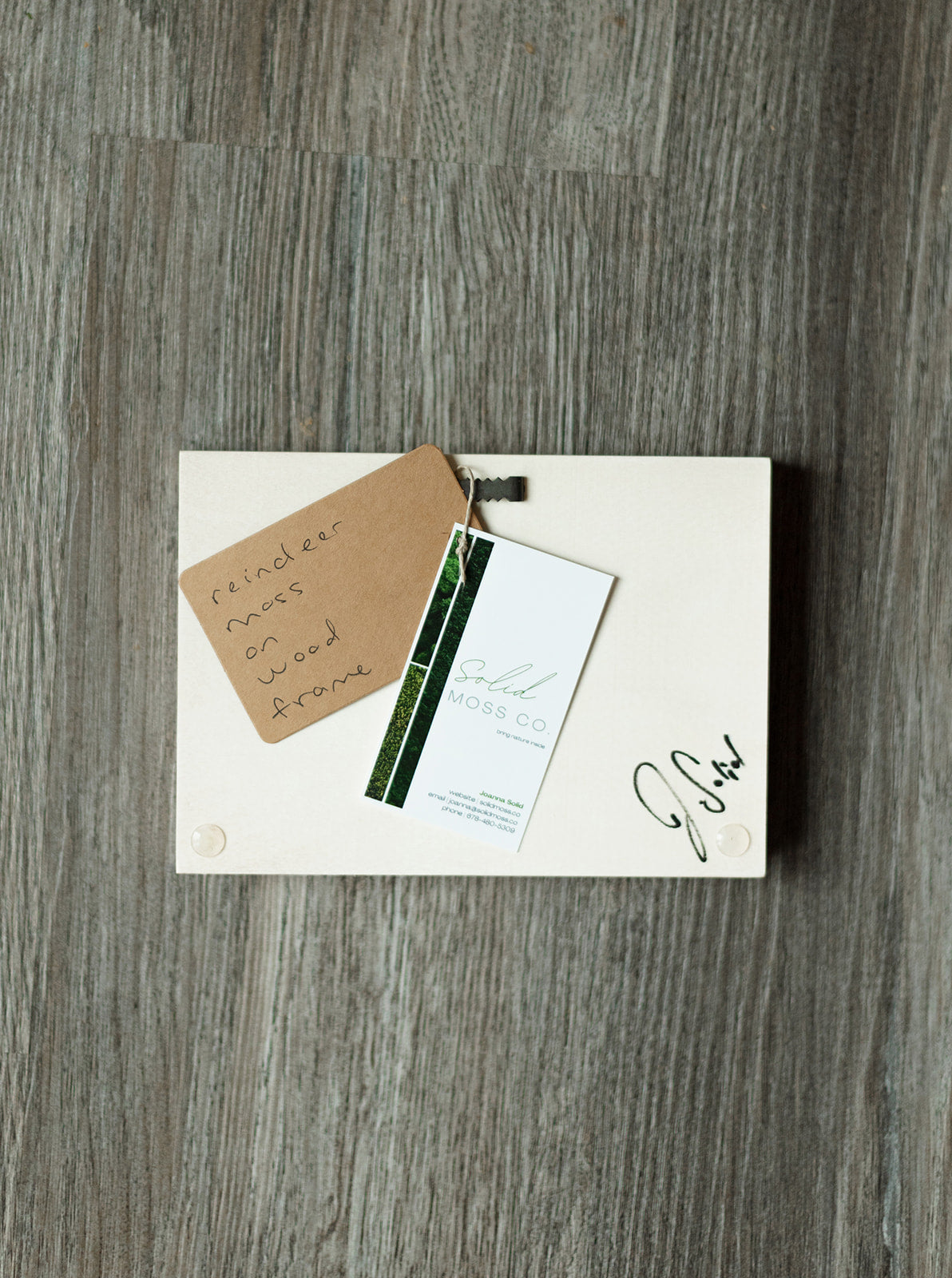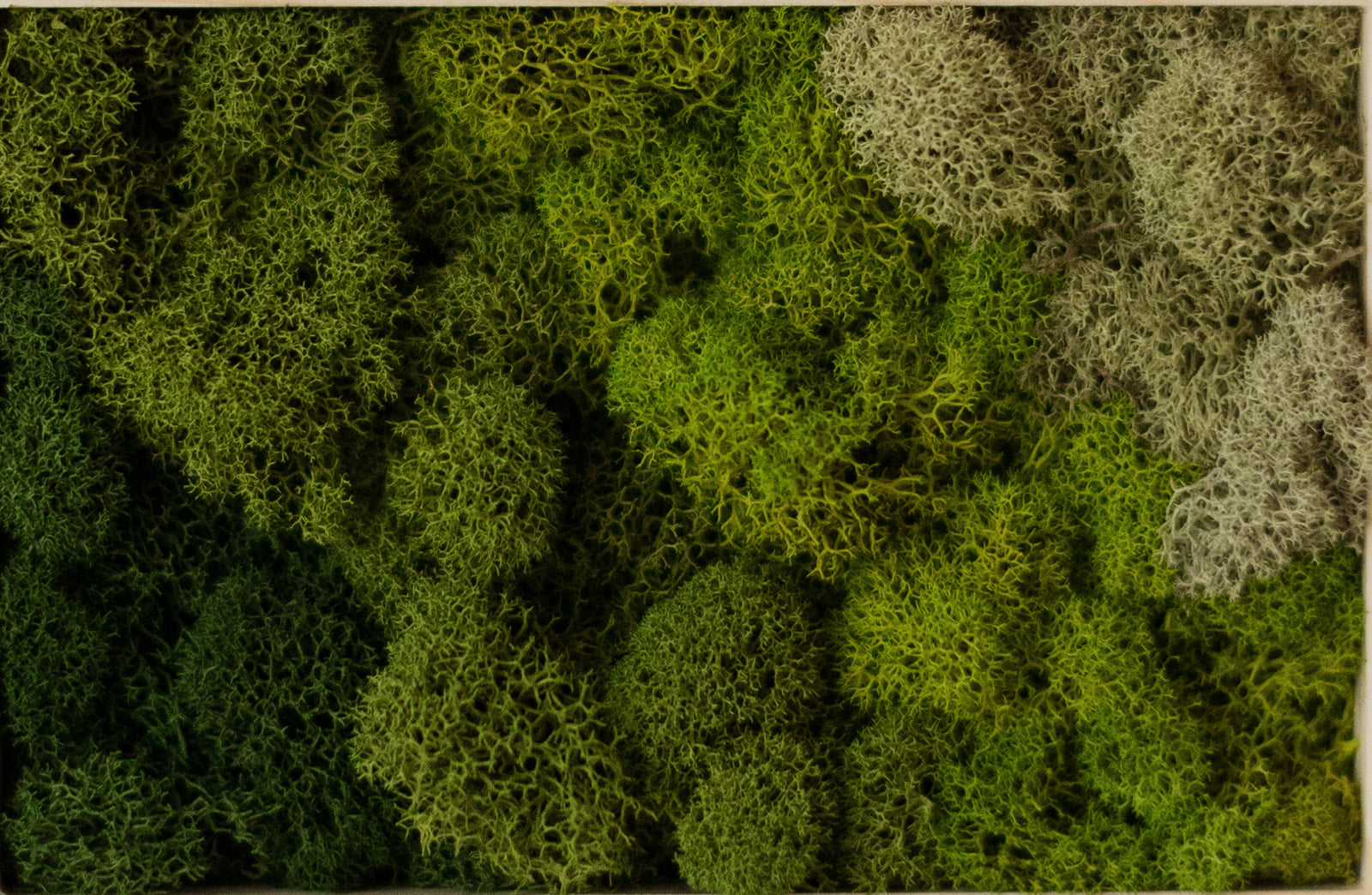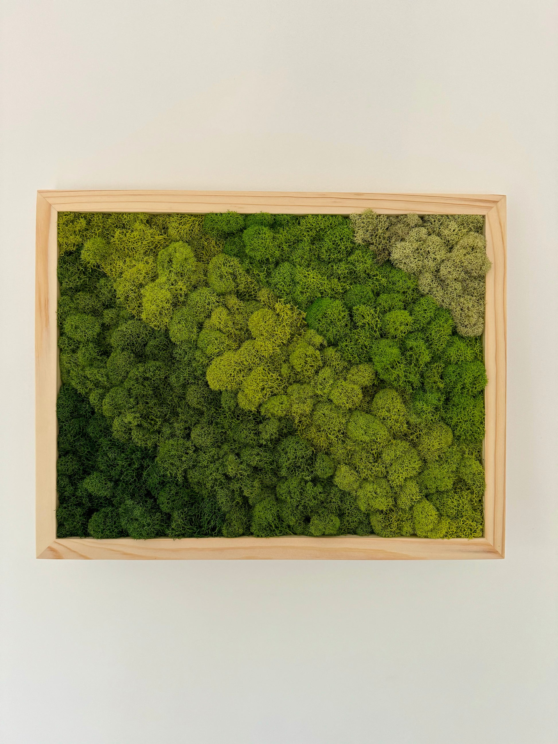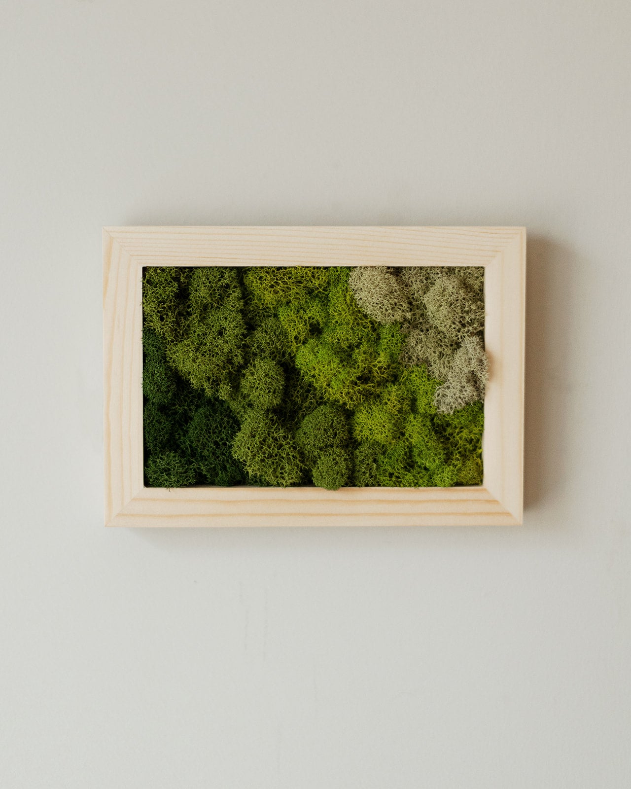 Preserved reindeer moss art on signed, ready-to-hang, horizontally orientated, rectangular wood frame.