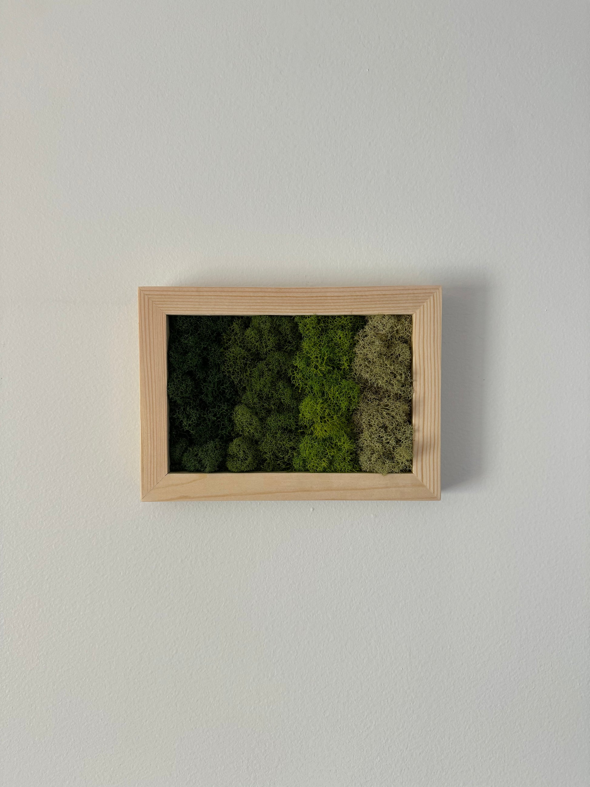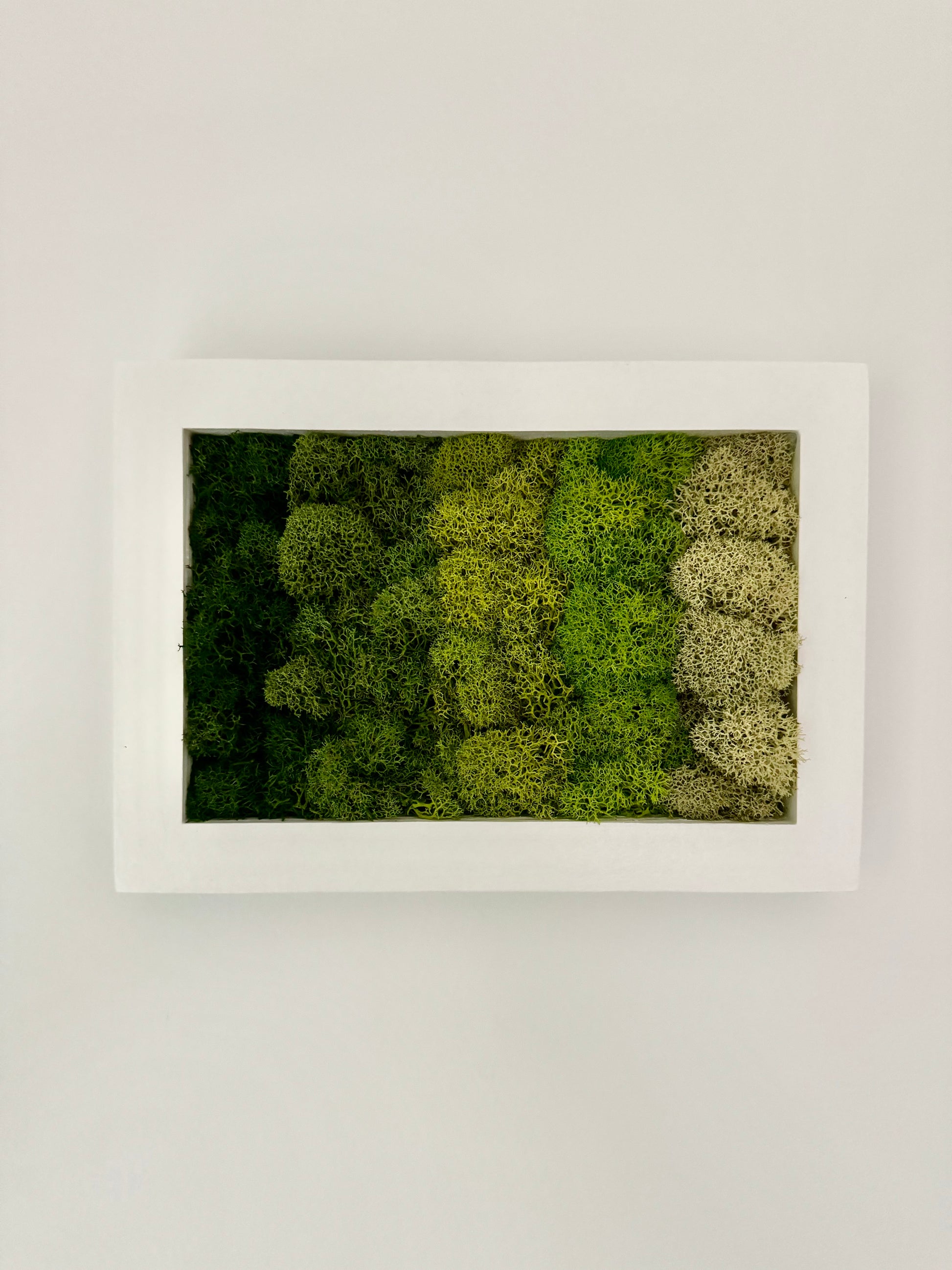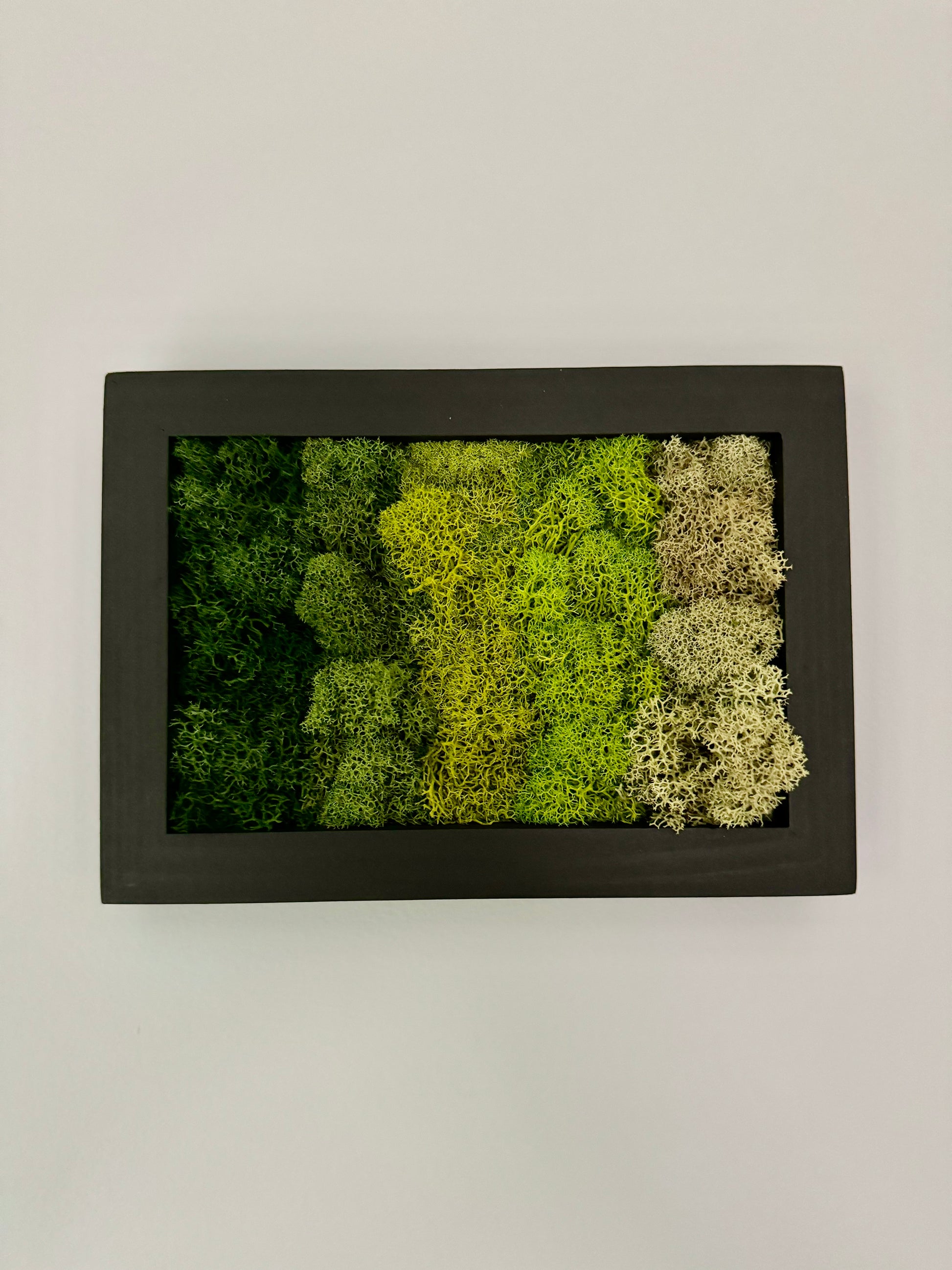 Preserved reindeer moss art on signed, ready-to-hang, horizontally orientated, rectangular wood frame.