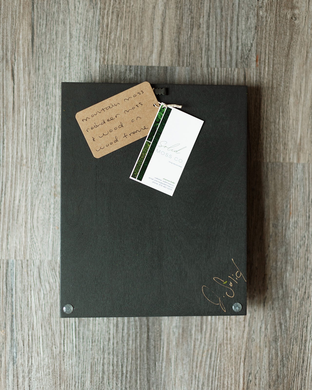 Preserved reindeer moss art on signed, ready-to-hang, vertically orientated, rectangular wood frame.