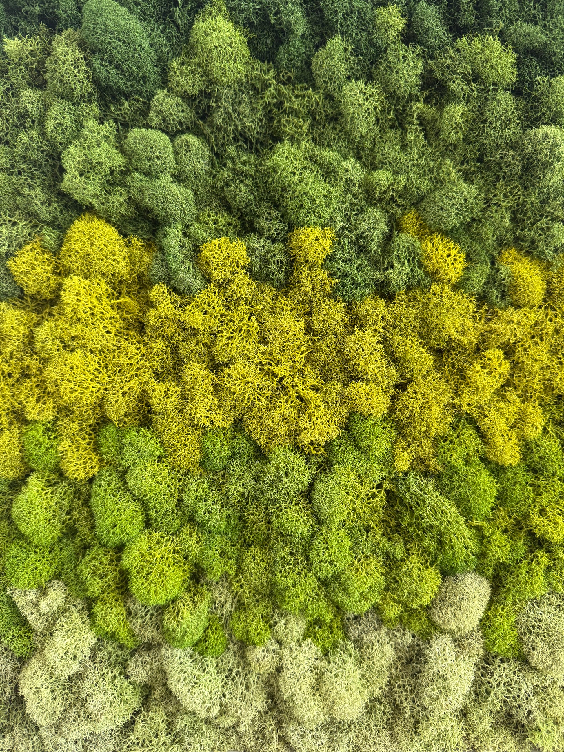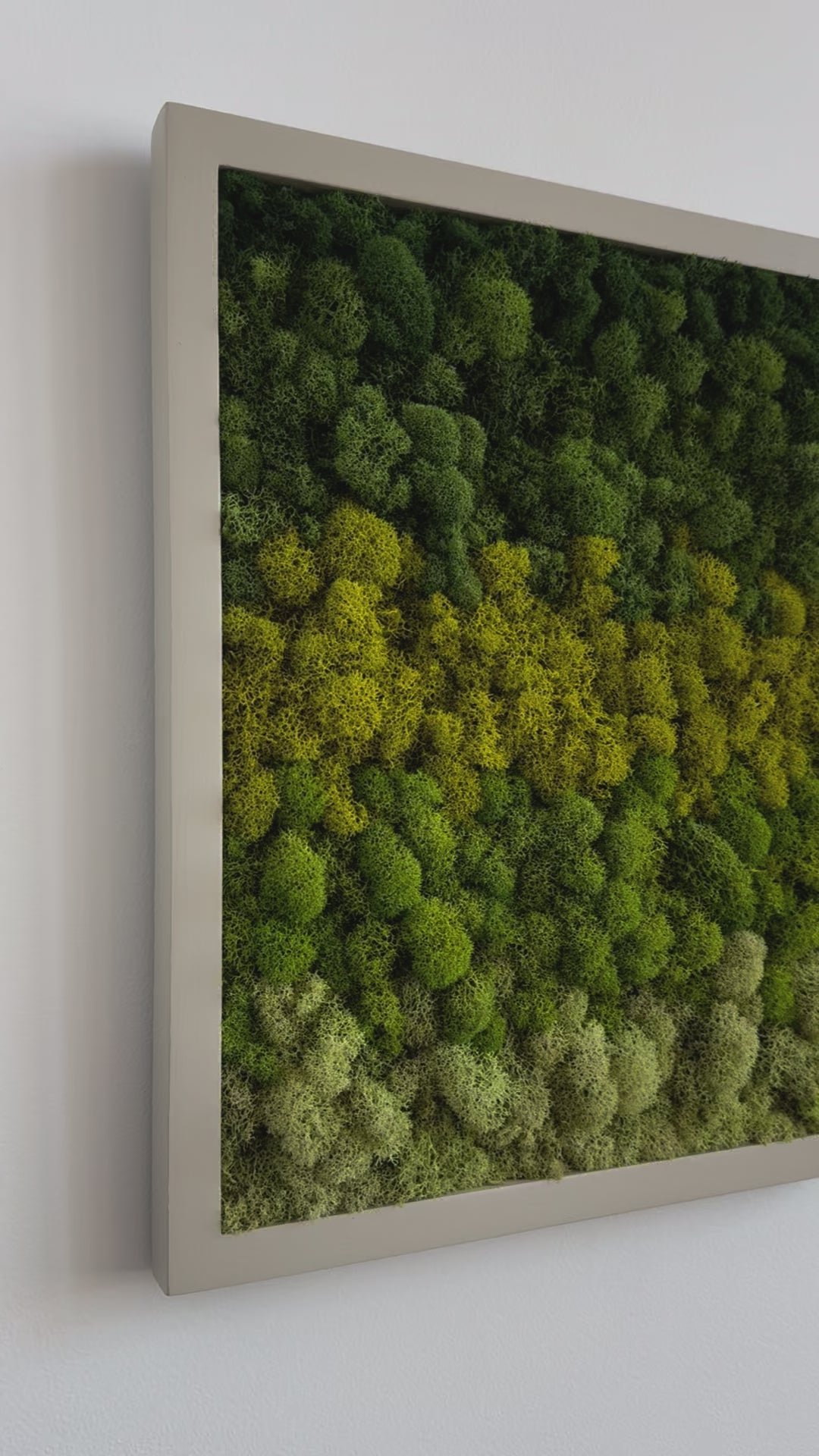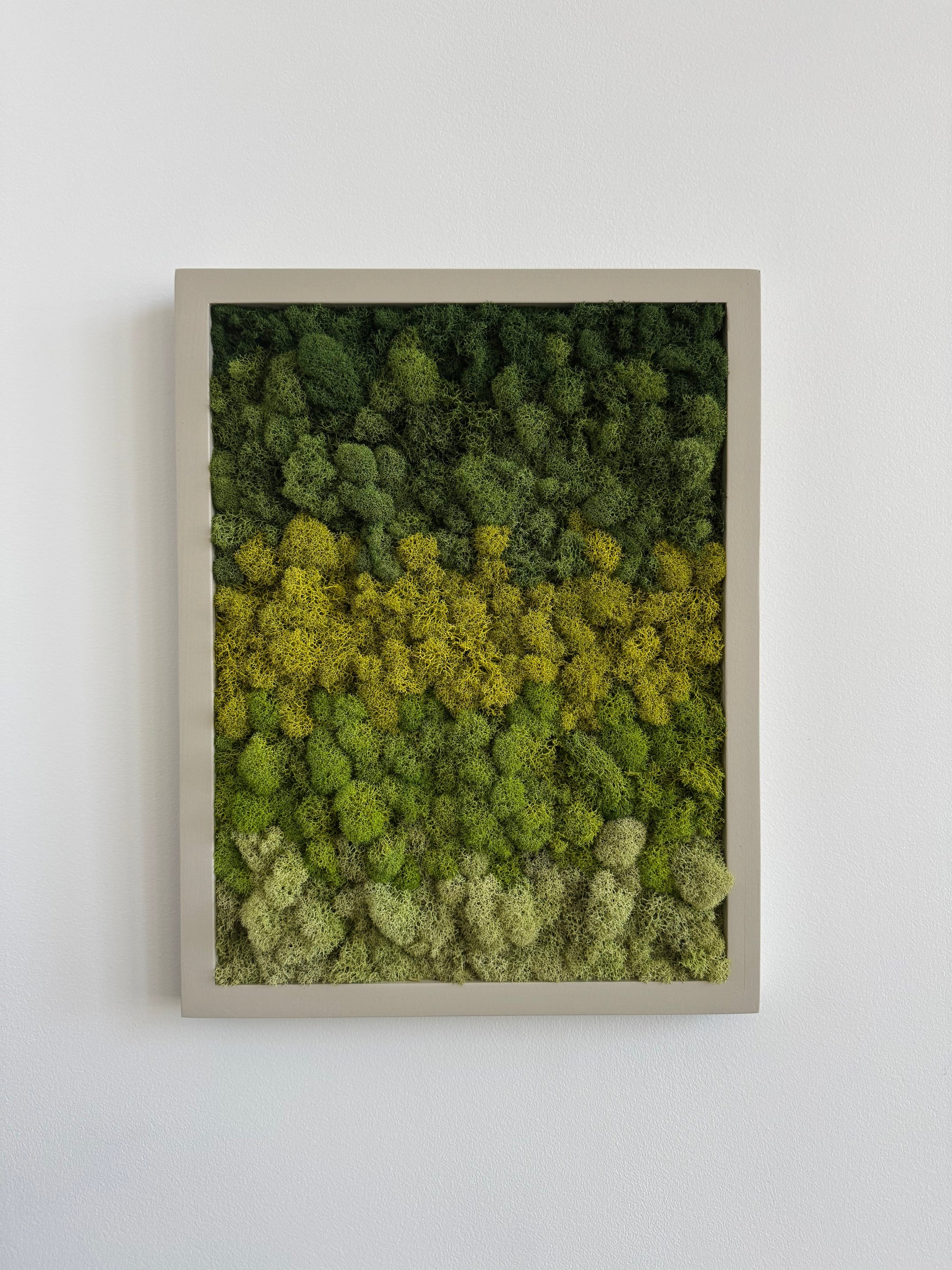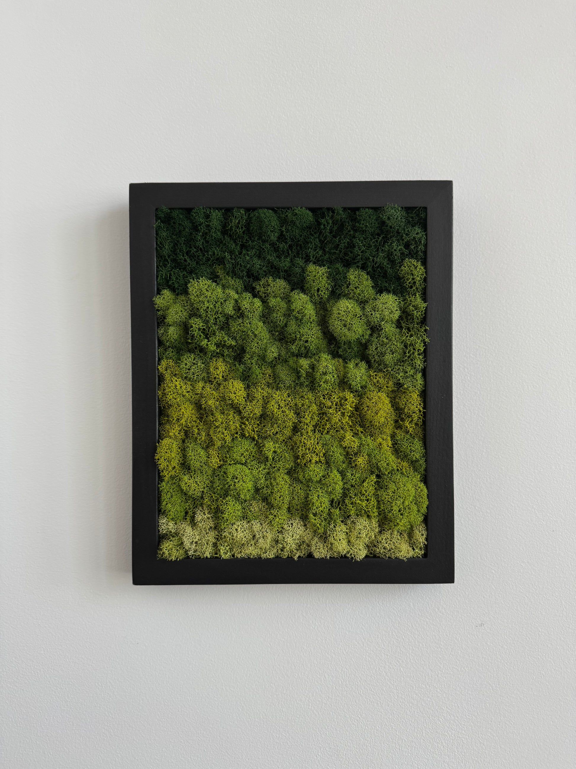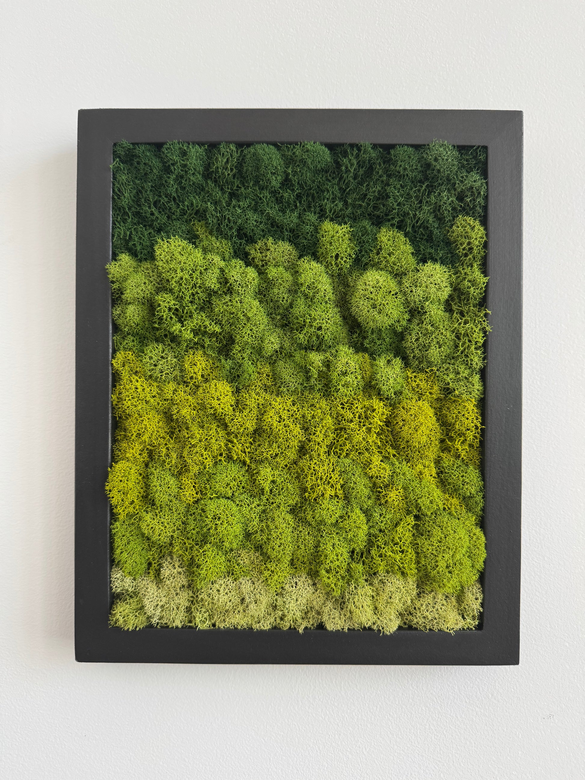 Preserved reindeer moss art on signed, ready-to-hang, vertically orientated, rectangular wood frame.