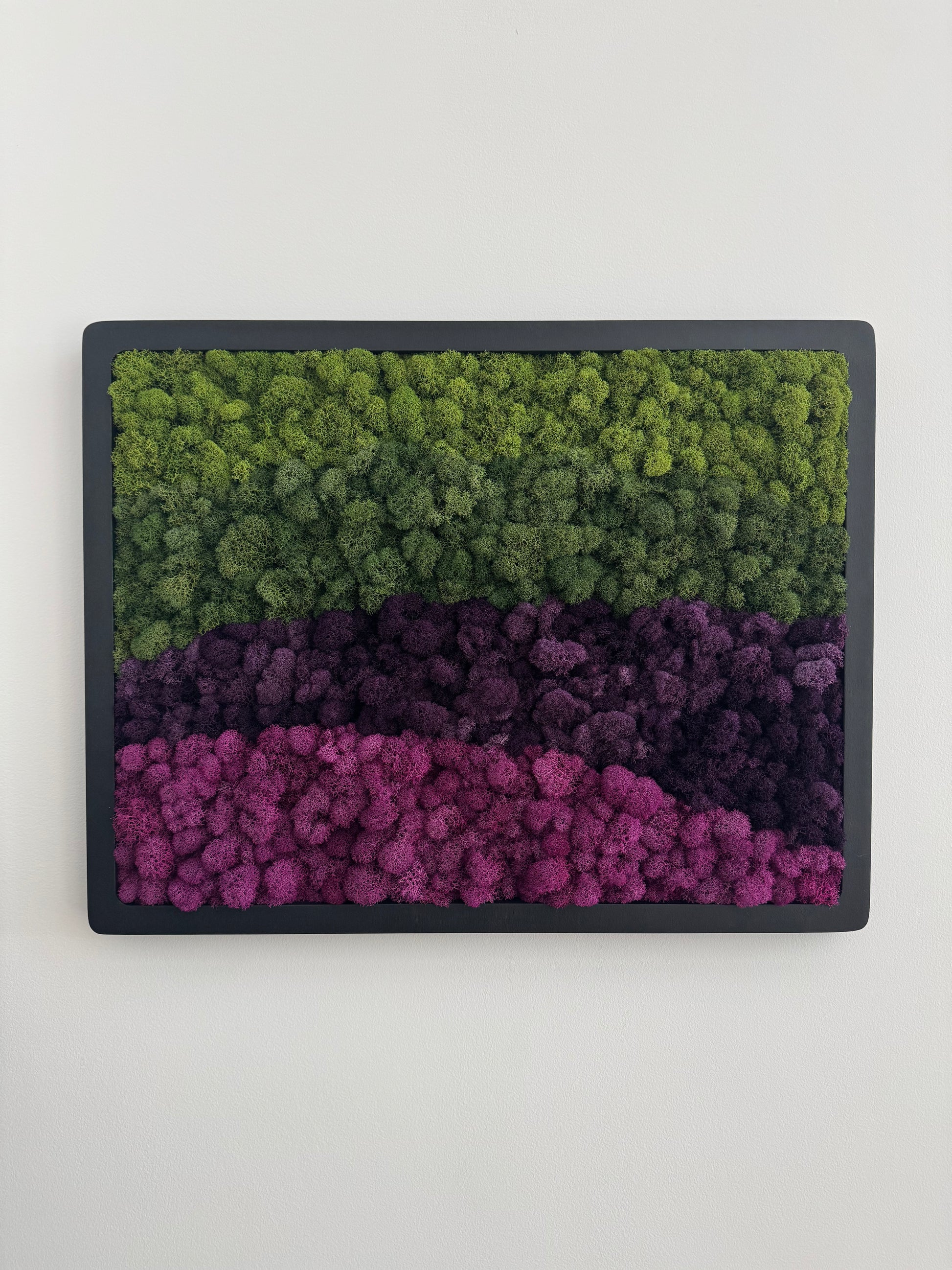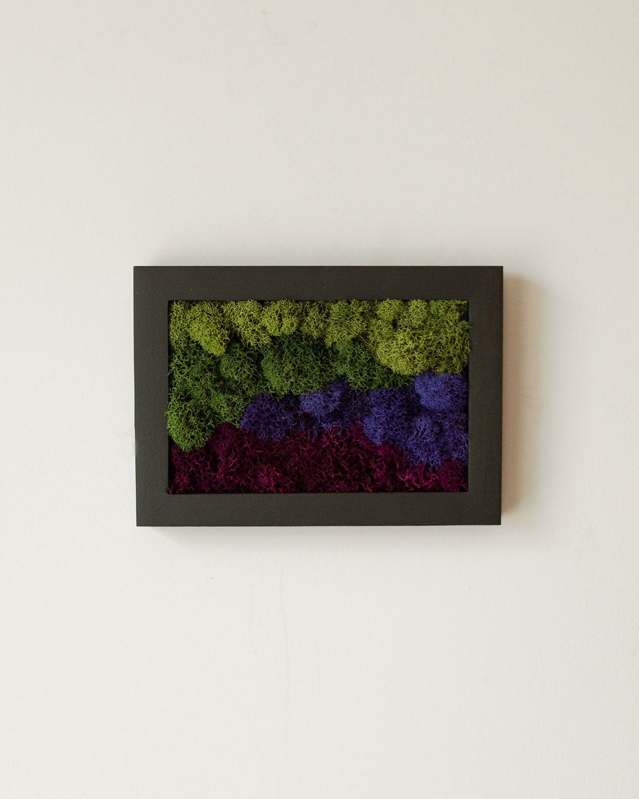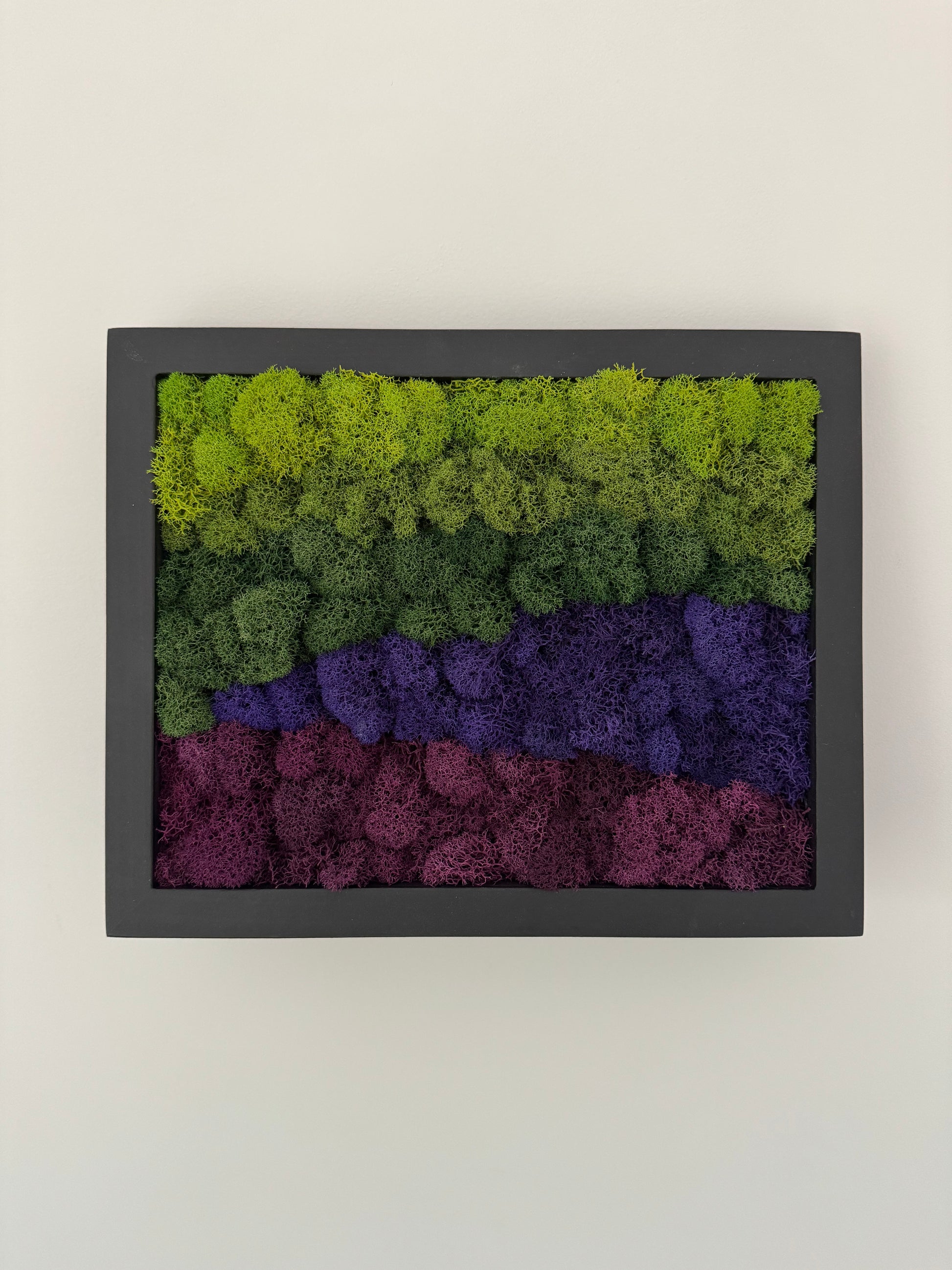 Preserved reindeer moss art on signed, ready-to-hang, horizontally orientated, rectangular wood frame.