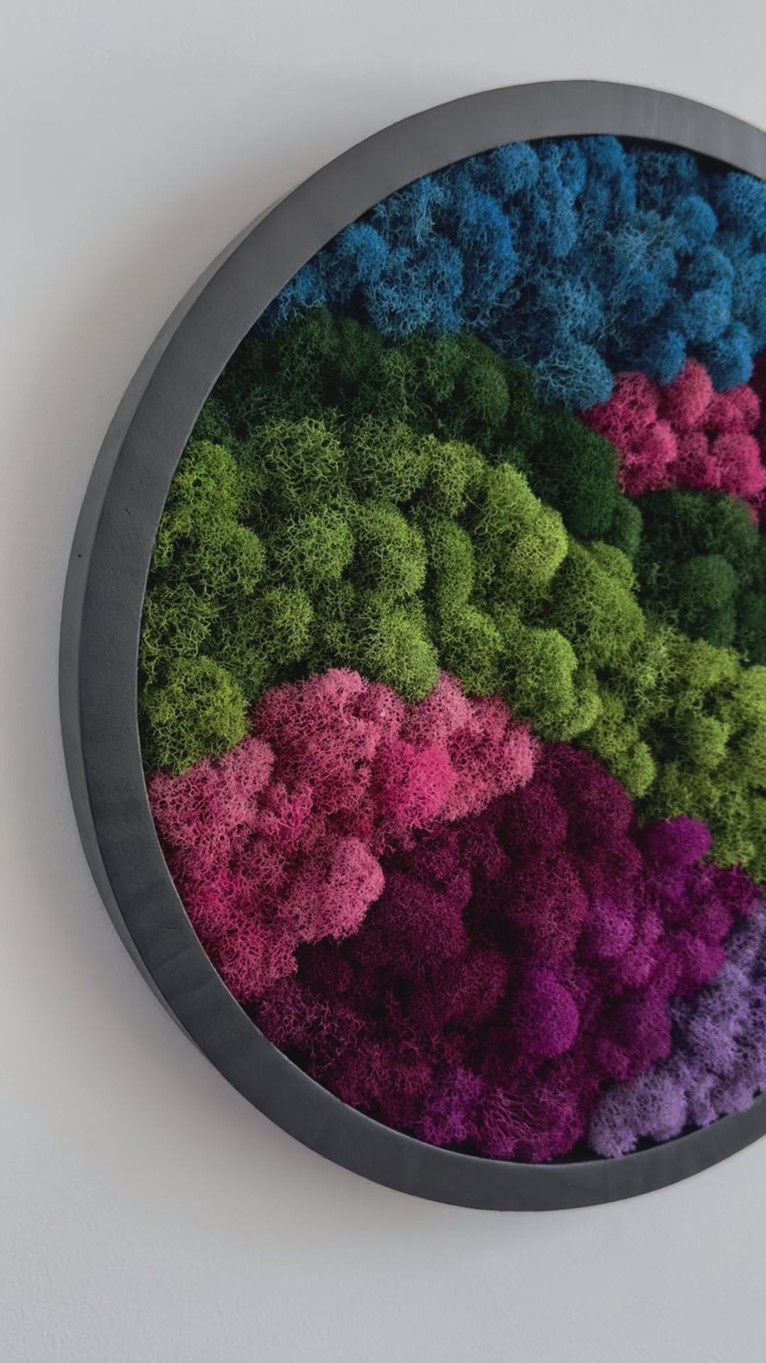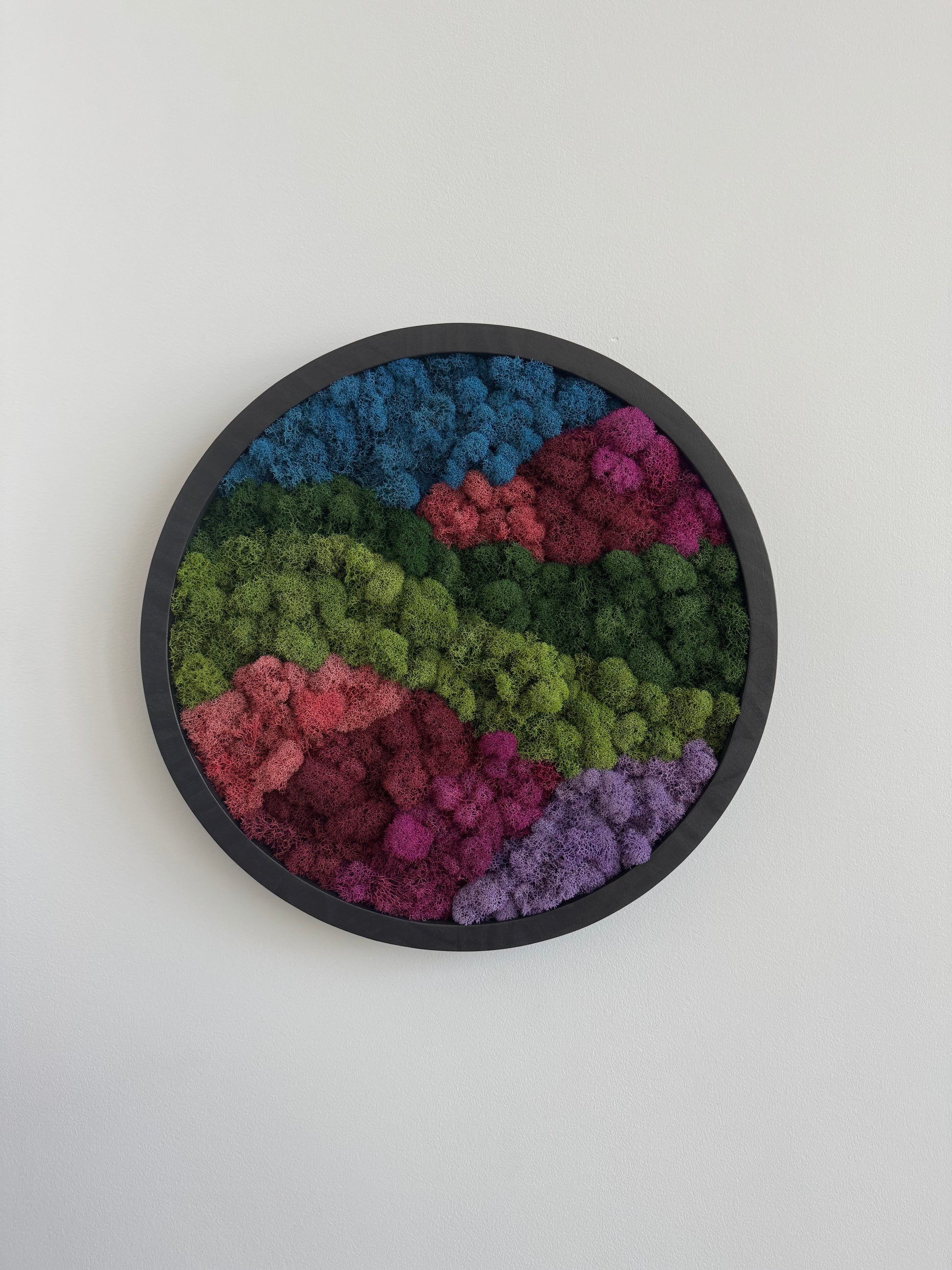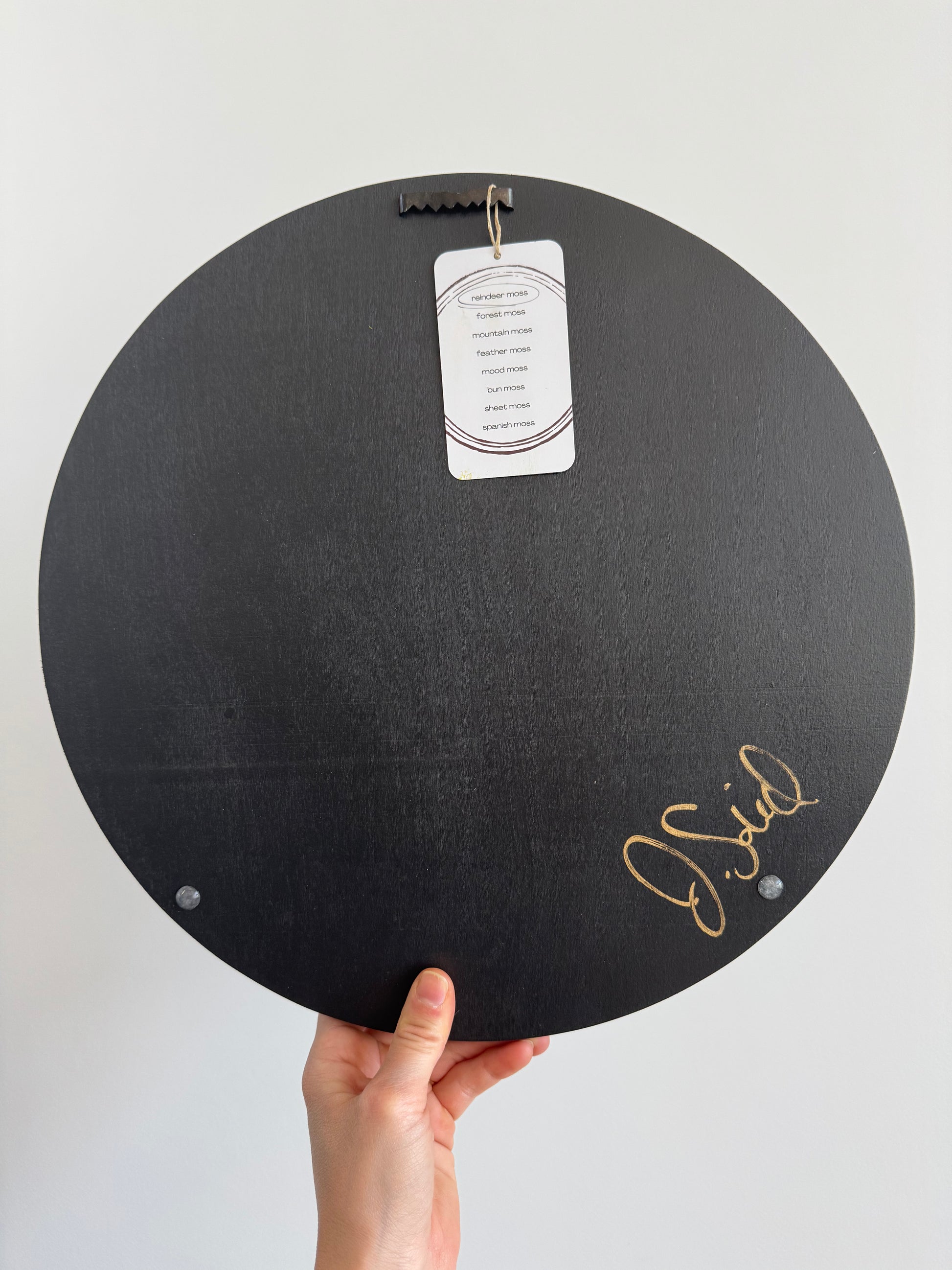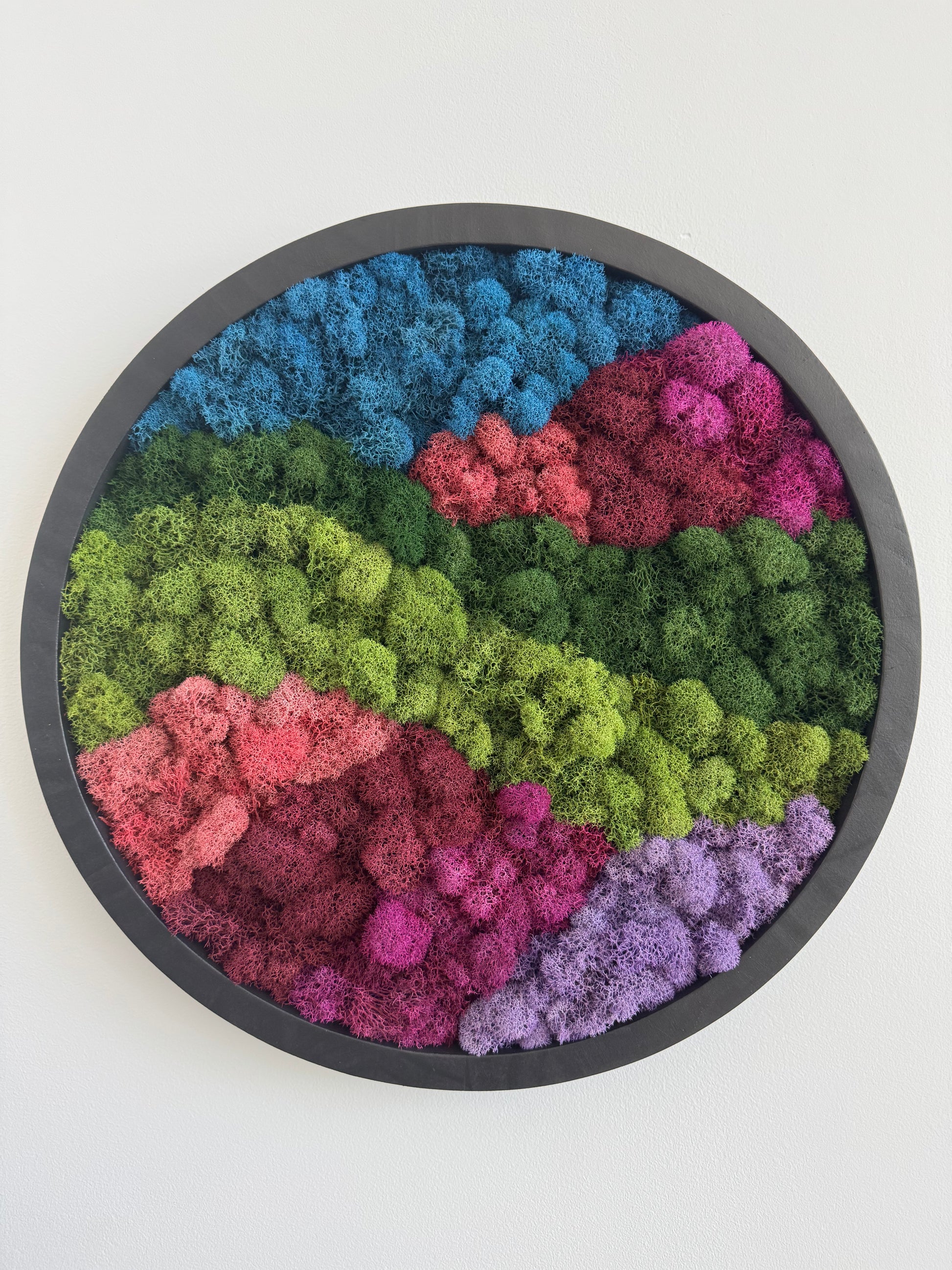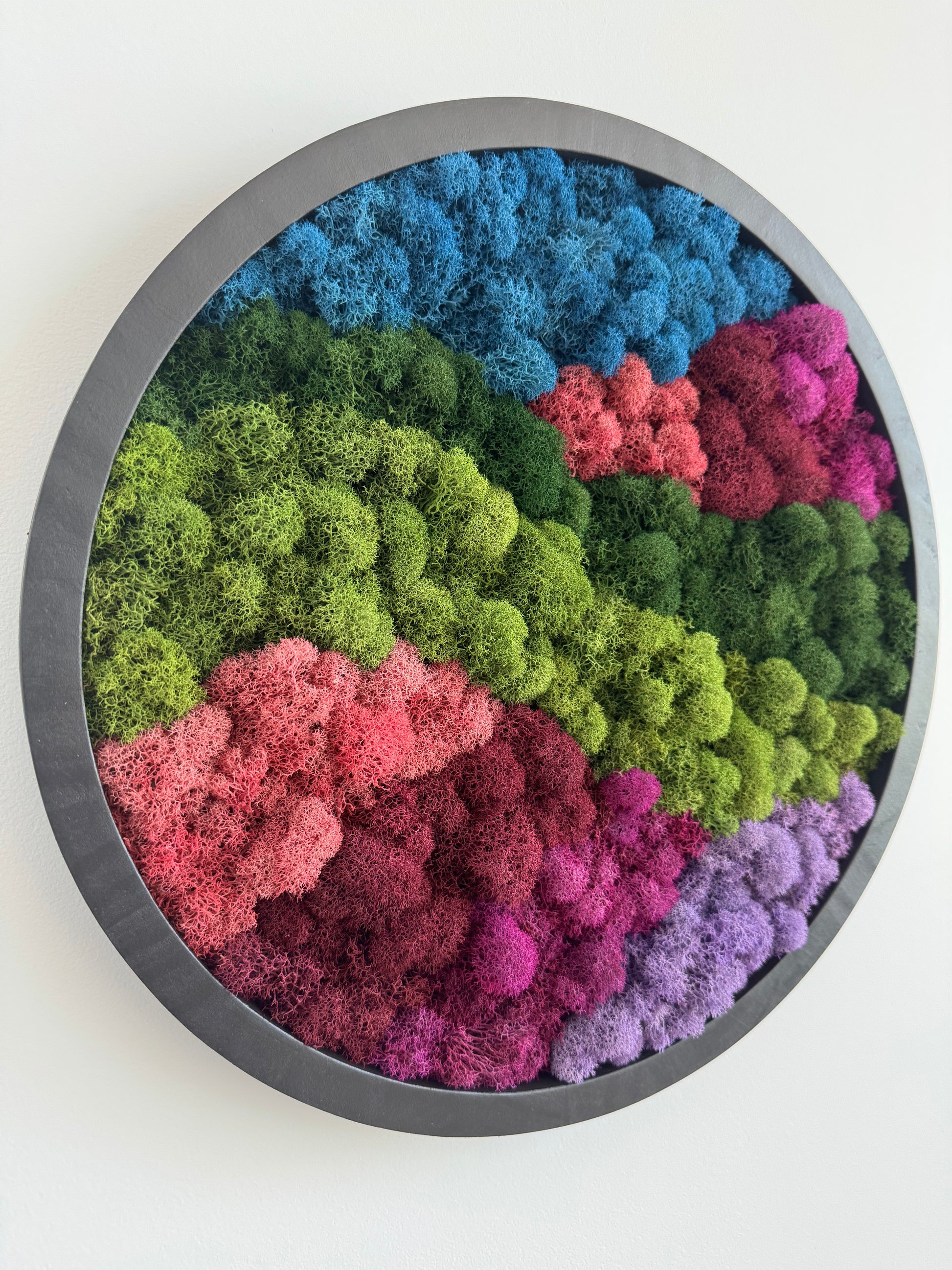 Preserved reindeer moss on signed, ready-to-hang, round wood frame.