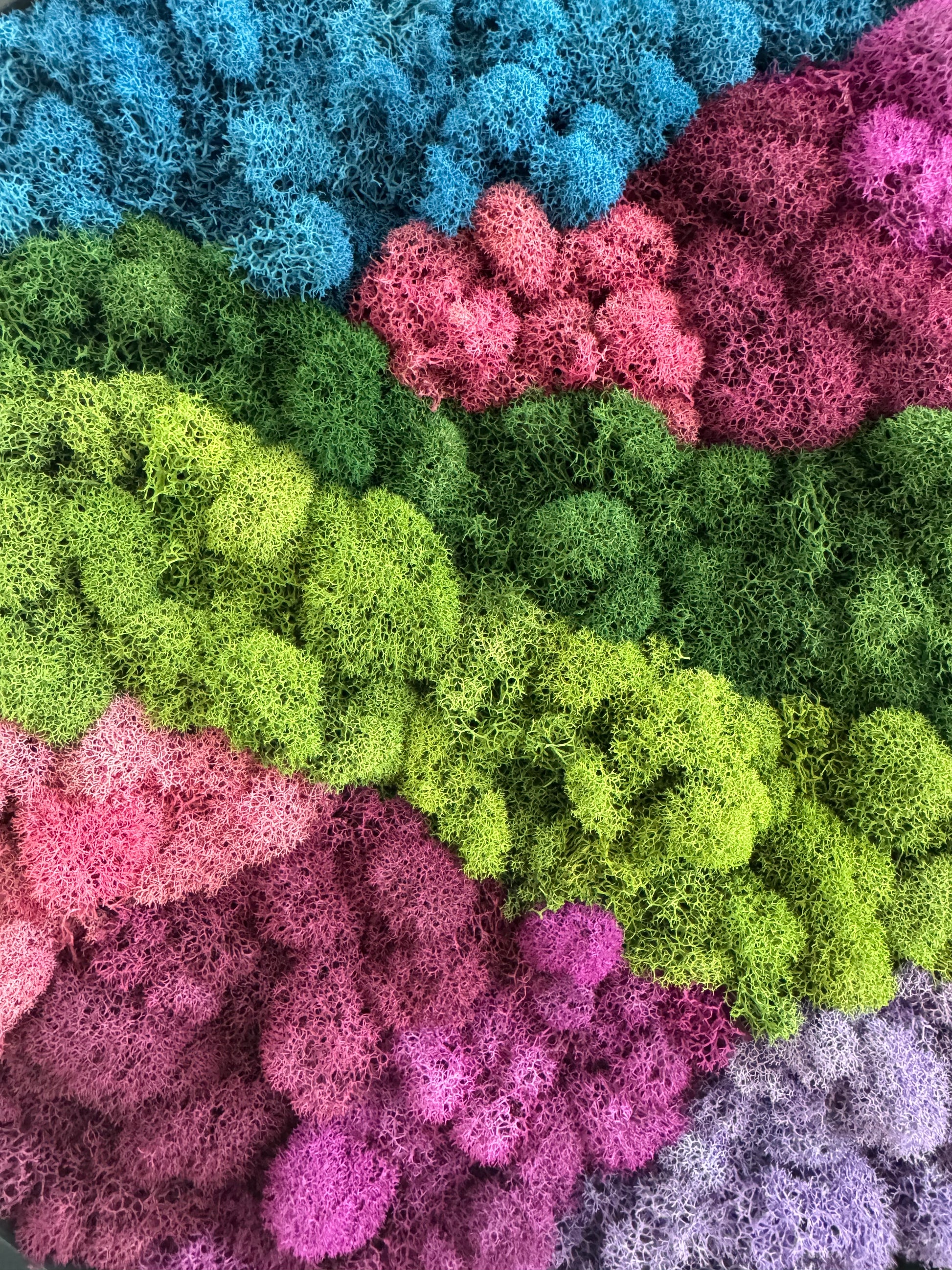 Includes: reindeer moss (multi-color green, wine, fuchsia, lavender, pink, and blue)